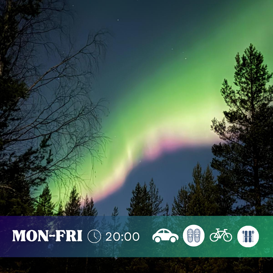 The sky dances, the snow sparkles — and you're standing right in the middle of it all. The campfire warms up, and with the help of our guide, you can capture that magical Northern Lights photo from your trip. Chase the aurora by car, snowshoes, e-bike, or sliding snowshoes.